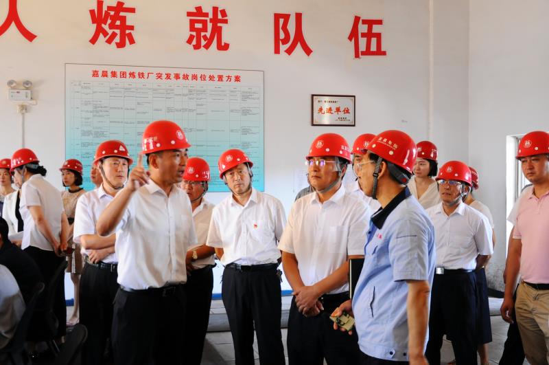 2018年7月20日,營口市老邊區(qū)人大常委會主任周立東,副主任孫朝林、呂光波、張?zhí)鞎?,副區(qū)長趙洪生、張靜賢,及區(qū)政府辦、安監(jiān)局的主要負責(zé)同志在嘉晨集團總裁趙松一的陪同下,來到營鋼公司煉鐵廠對生產(chǎn)安全情況進行視察調(diào)研。