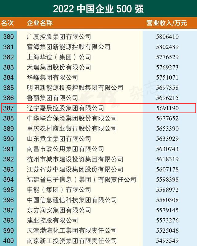 9月6日,中國企業(yè)聯(lián)合會,中國企業(yè)家協(xié)會在京發(fā)布了“2022中國企業(yè)500強(qiáng)”榜單,遼寧嘉晨控股集團(tuán)榜單排名387位。今年是“中國企業(yè)500強(qiáng)”榜單自發(fā)布以來入圍門檻絕對值提高最多的一年。